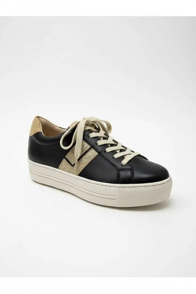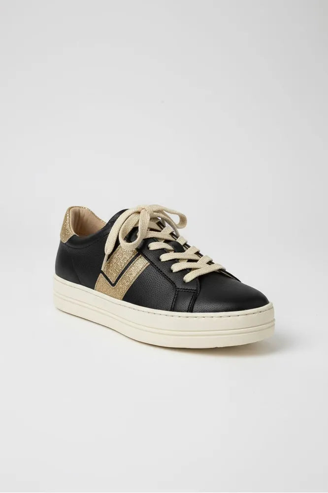 A stylish everyday trainer featuring leather and suede and a contrast gold sparkle side panel. Super soft and finished with beige panel detail with studs at back. Lace up with beige suede tongue, softly lined interior and chunky rubber fashionable sole.