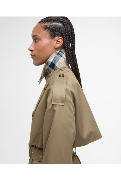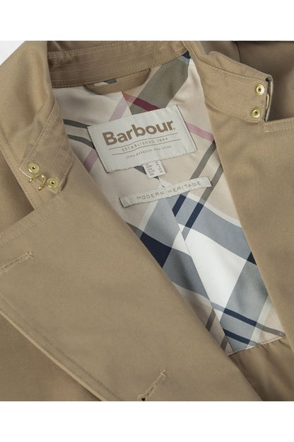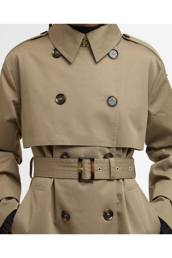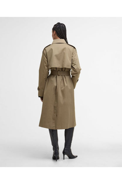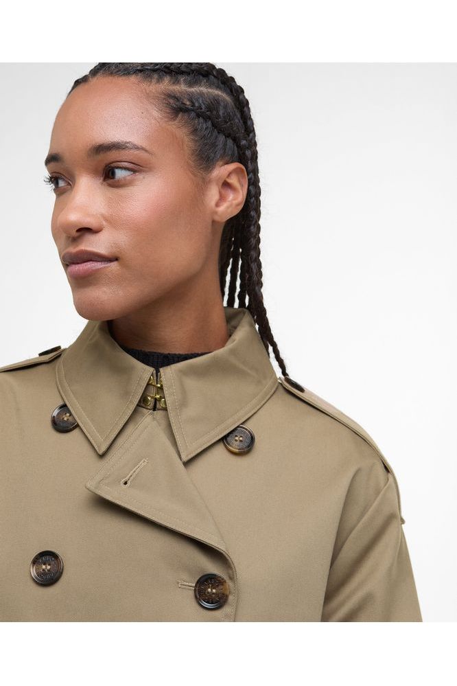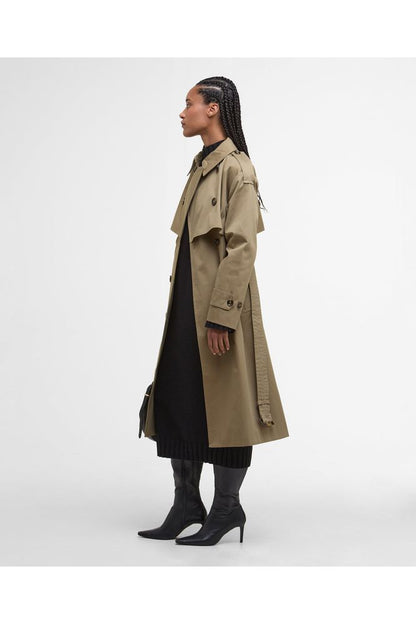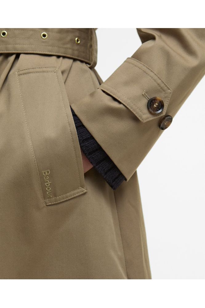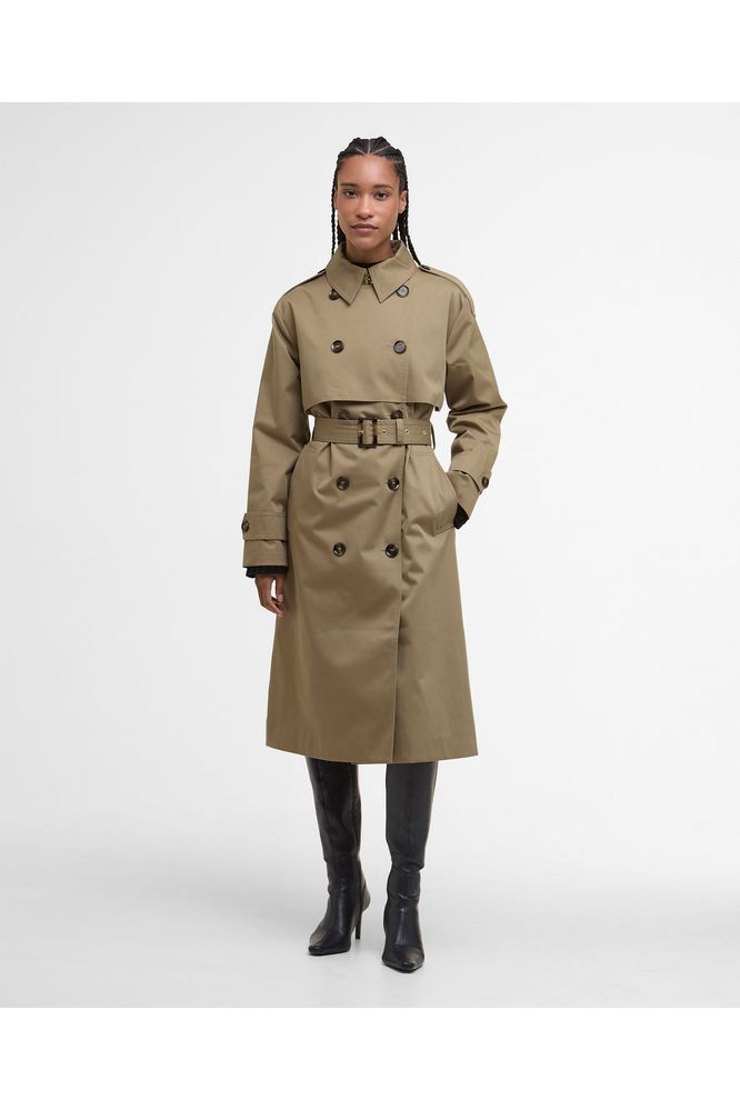 Classic sophistication and practicality from this Barbour Aoife Trenchcoat. Showerproof, double breasted, epaulettes and front detail. Buckle belt to create shape and cuff straps that can be adjusted to suit.