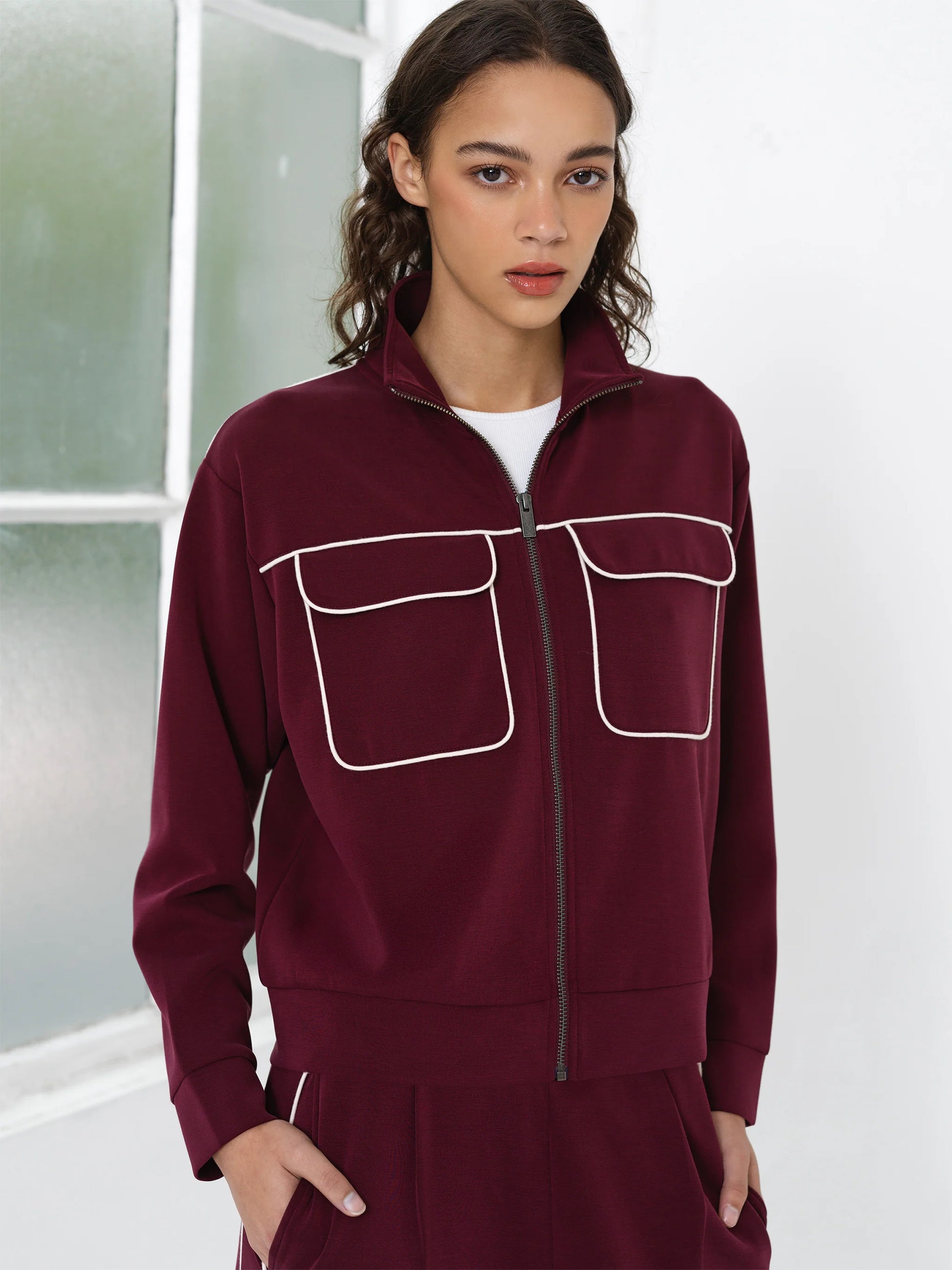 Embrace luxe comfort with the French Connection Wren Sweatshirt in rich berry. This sumptuously soft essential features a sleek stand collar and smooth fabric that feels as good as it looks. The full-length metal zip fastening allows effortless layering, whilst bold flap breast pockets trimmed in contrasting piping add contemporary detail and practicality. Long sleeves provide warmth without bulk, making it perfect for transitional seasons. Pair it with the matching Wren Side Piping Wide Leg Trousers to complete a sophisticated co-ord that balances relaxed elegance with polished style.