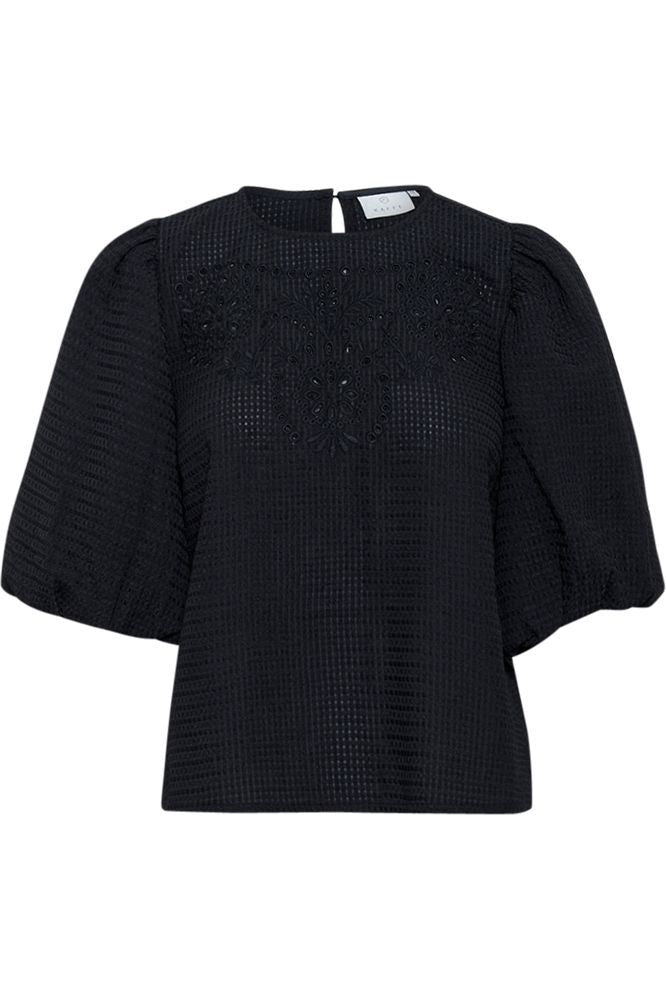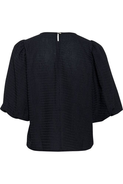 The Kaffe Melani Blouse features elegant elbow-length puff sleeves and a textured fabric that adds subtle depth to your look. Its loose fit ensures comfort throughout the day, while the delicate cut-outs at the neckline provide a stylish, modern touch. Perfect for dressing up or down, this blouse effortlessly combines sophistication with ease.