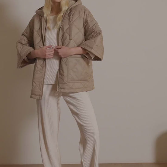 Showcasing a woven diamond pattern and elegant flared sleeves, this hooded quilted jacket brings sophistication to cooler days. Designed for both style and function, it’s finished with a zip-front closure, patch pockets, and side vents for ease of movement.