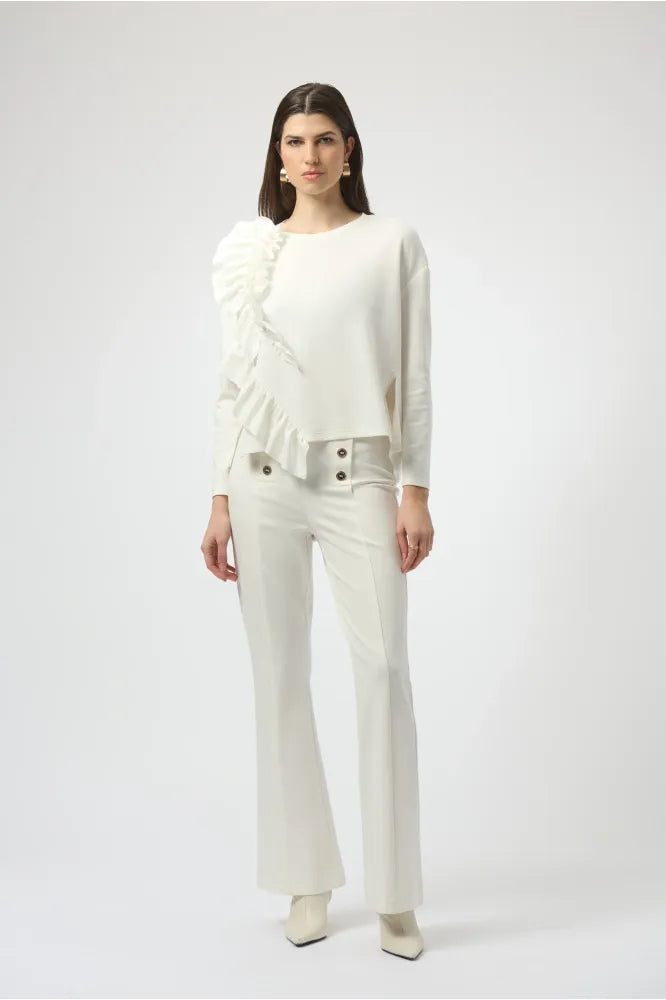 This delightful scuba jersey top features ruffled trim for a touch of playful charm. Designed with a straight silhouette and long sleeves, it’s a versatile addition to your casual wardrobe.