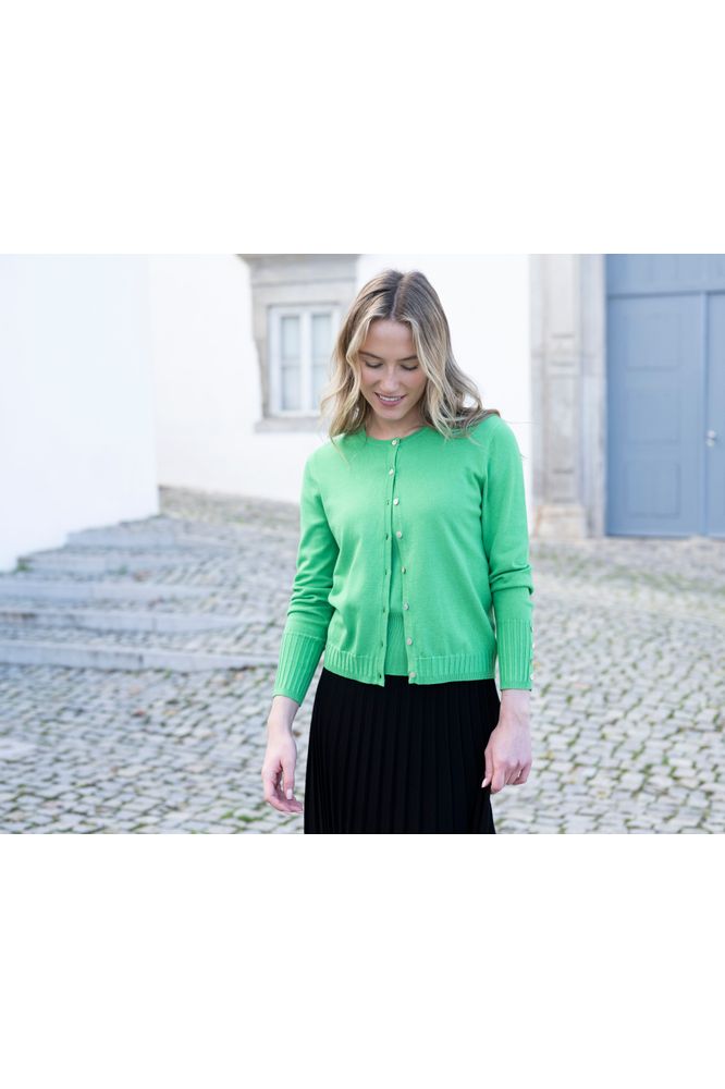 Elevate your everyday wardrobe with this classic round neck cardigan in a sophisticated green shade. Thoughtfully designed with distinctive detail work along the cuff and hemline, it transforms a timeless silhouette into something truly special. The refined embellishments add visual interest without compromising the piece's versatility, making it perfect for layering over dresses, tees, or worn solo. A wardrobe essential that bridges casual comfort with understated elegance.
