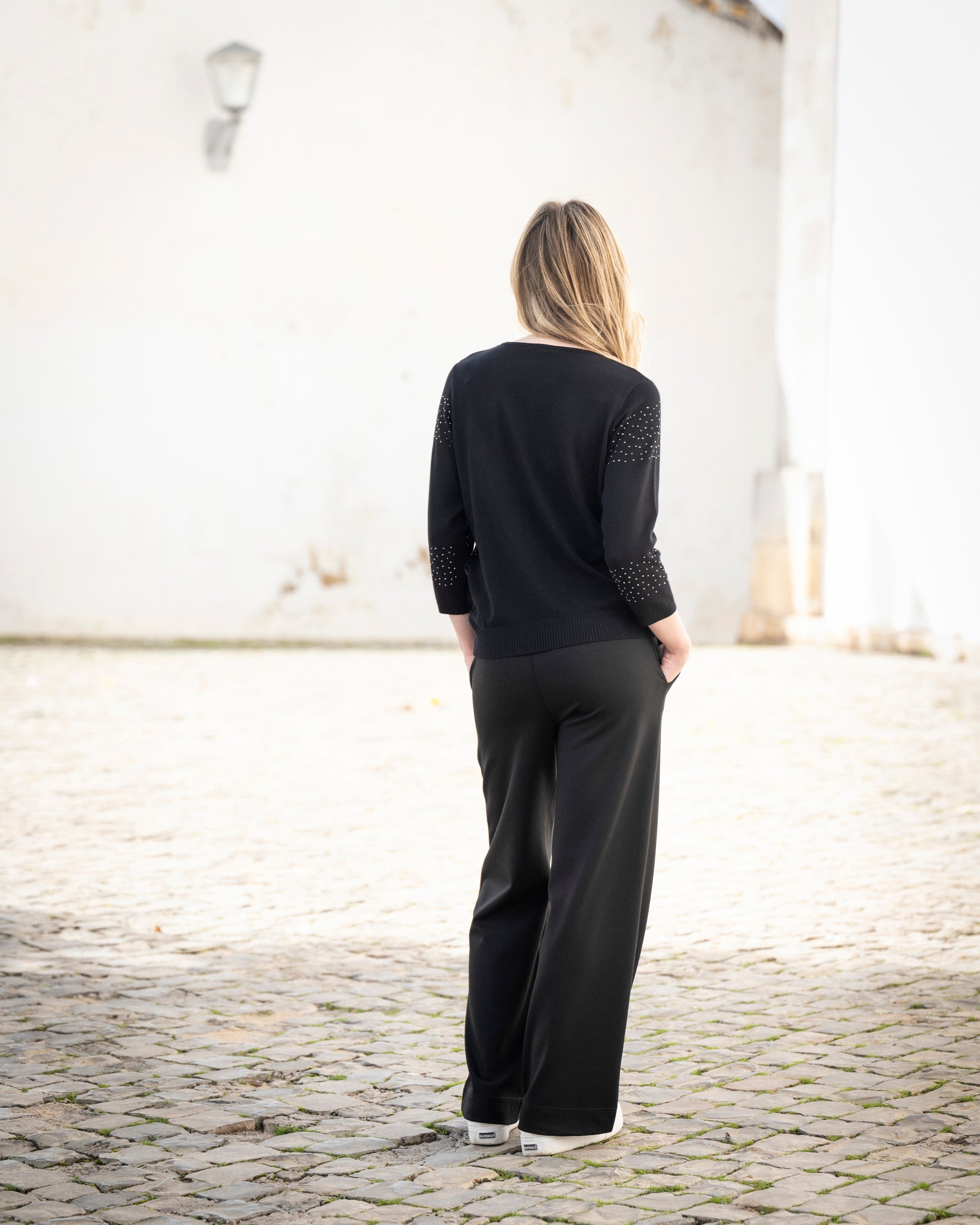 Elevate your everyday wardrobe with this sophisticated black fine knit sweater. Crafted from premium knit fabric, it delivers a refined silhouette that transitions seamlessly from office to evening. The subtle stud embellishments adorning the front and sleeves add an unexpected touch of edge, transforming a classic piece into something distinctly modern. Versatile enough to pair with tailored trousers or your favourite jeans, this sweater is the investment piece you'll reach for season after season.