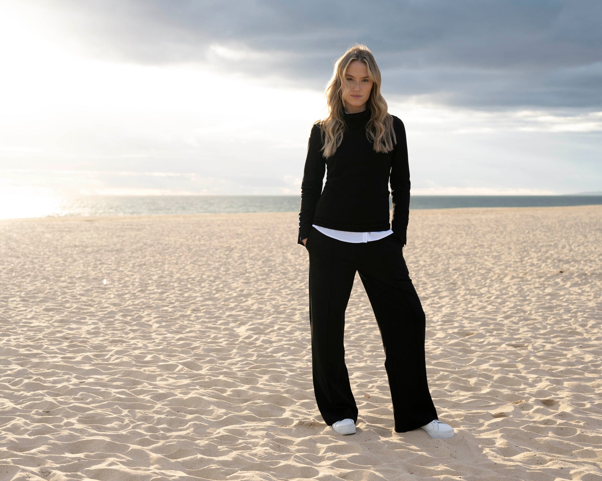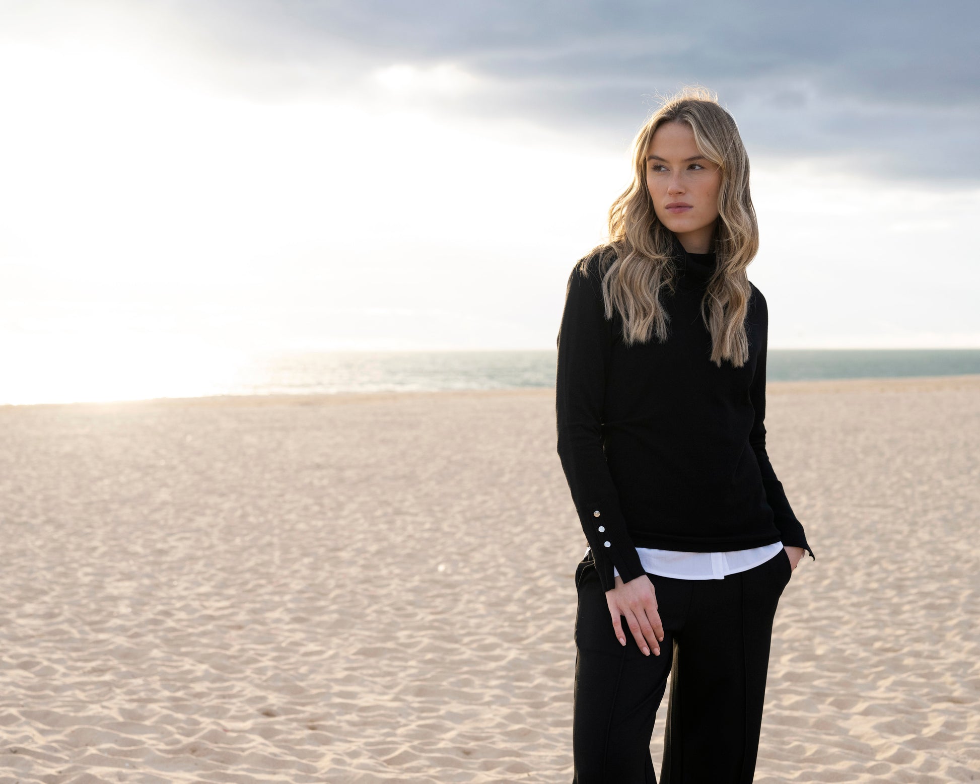 Elevate your everyday wardrobe with this sophisticated Marble Sweater in classic black. Featuring a refined high neckline and long sleeves, this piece combines timeless elegance with thoughtful design details. The distinctive button embellishment near the slit cuff line adds a touch of understated luxury, transforming a simple sweater into a statement piece. Perfect for layering or wearing solo, this versatile knit transitions seamlessly from office to weekend, offering both comfort and style that works harder than ordinary basics.