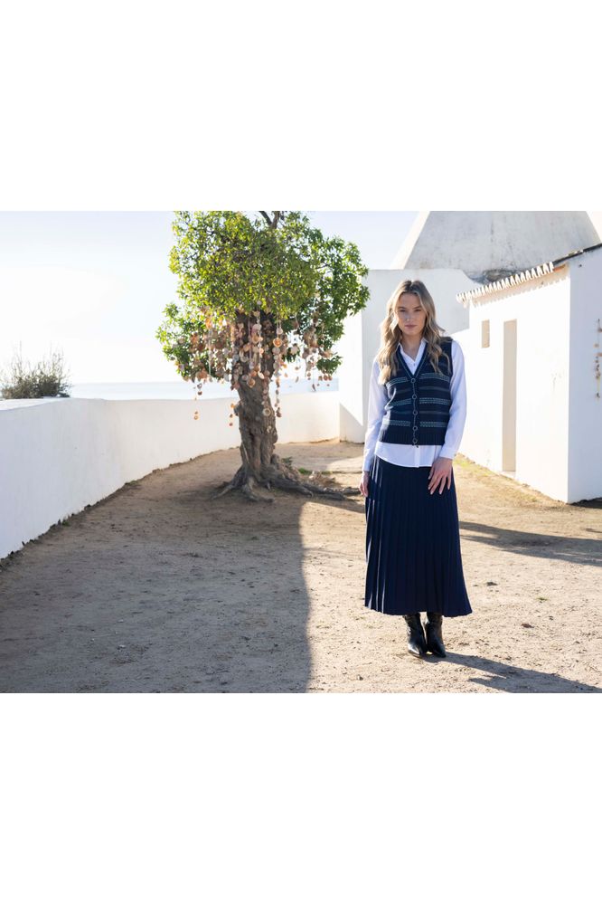 Elevate your wardrobe with this vest top, featuring a sophisticated colour-block design in navy and seafoam. The coordinating button-through front adds a polished, intentional touch that transitions effortlessly from casual to dressed-up occasions. Crafted for versatility, this piece pairs beautifully with tailored trousers, denim, or layered under lightweight knitwear. The harmonious colour palette brings a fresh, contemporary edge to any outfit, making it an essential addition to your everyday collection.