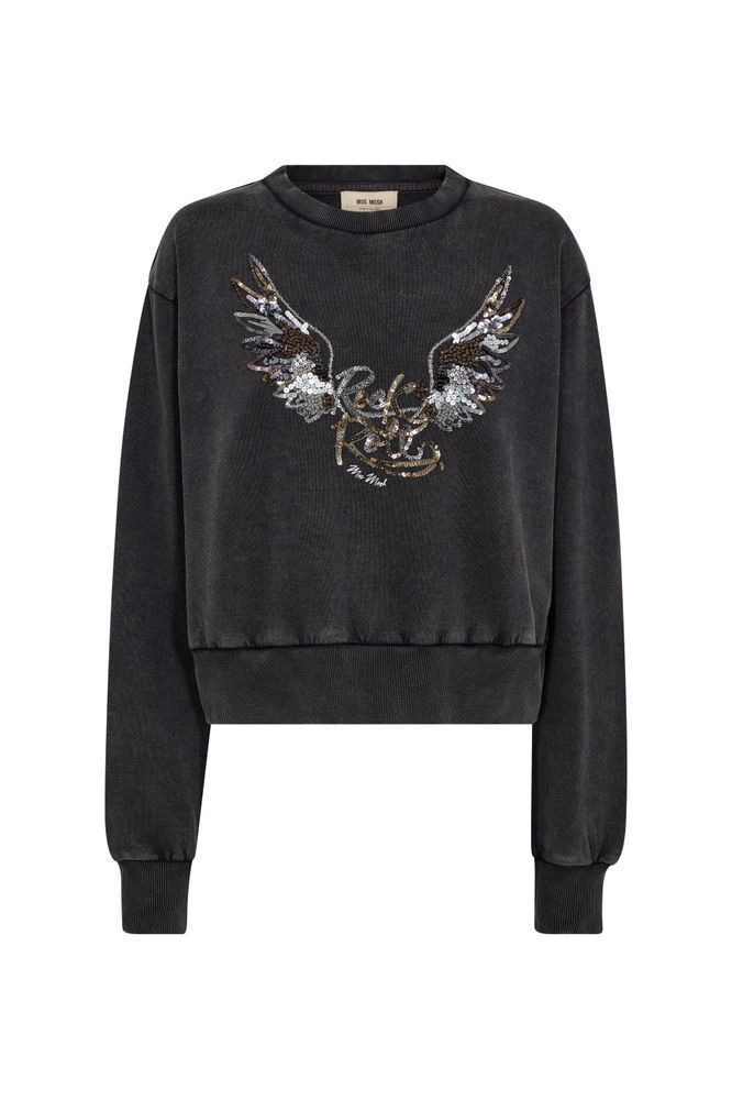 This statement sweatshirt is designed in a loose fit with long sleeves and classic rib details at the neckline, cuffs, and hem for a comfortable yet stylish look. The bold rock’n’roll print at the front, enhanced with shimmering sequin details, adds a striking and edgy touch. Perfect for effortless styling, it pairs well with jeans or leather pants for a cool and rebellious vibe.