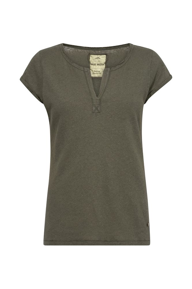 Elevate your everyday style with the Mos Mosh Troy Tee in Army. This versatile piece features a feminine placket detail in contrasting fabric that adds subtle sophistication to your rotation. Crafted from a premium slub cotton and linen blend, it offers breathable comfort with natural texture and movement. Finished with flattering roll edge sleeves, this tee pairs effortlessly with denim for an understated, polished look that works from day to night.