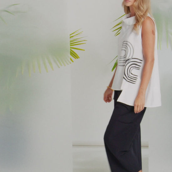NAYA introduce a stunning long line sleeveless top to the season. Featuring a wrap collar, this top excites thanks to the crisp colour that is then adorned with a semi circle print to just one side of the bodice . The hemline dips just a little on each side adding to the mystery. A top you will love to wear day or night.
