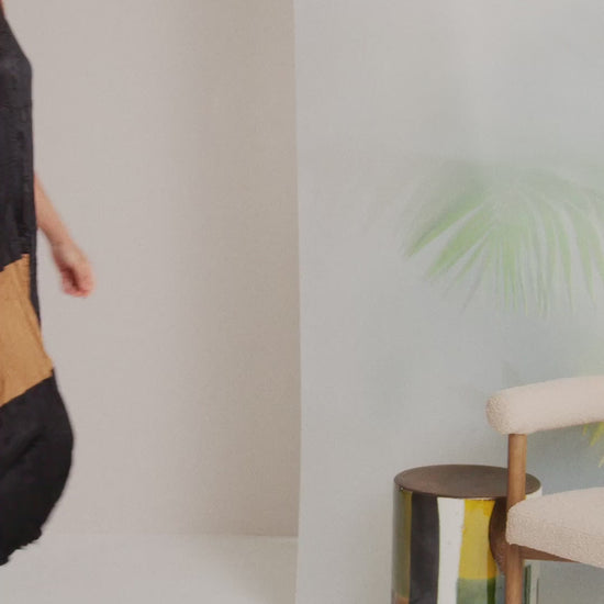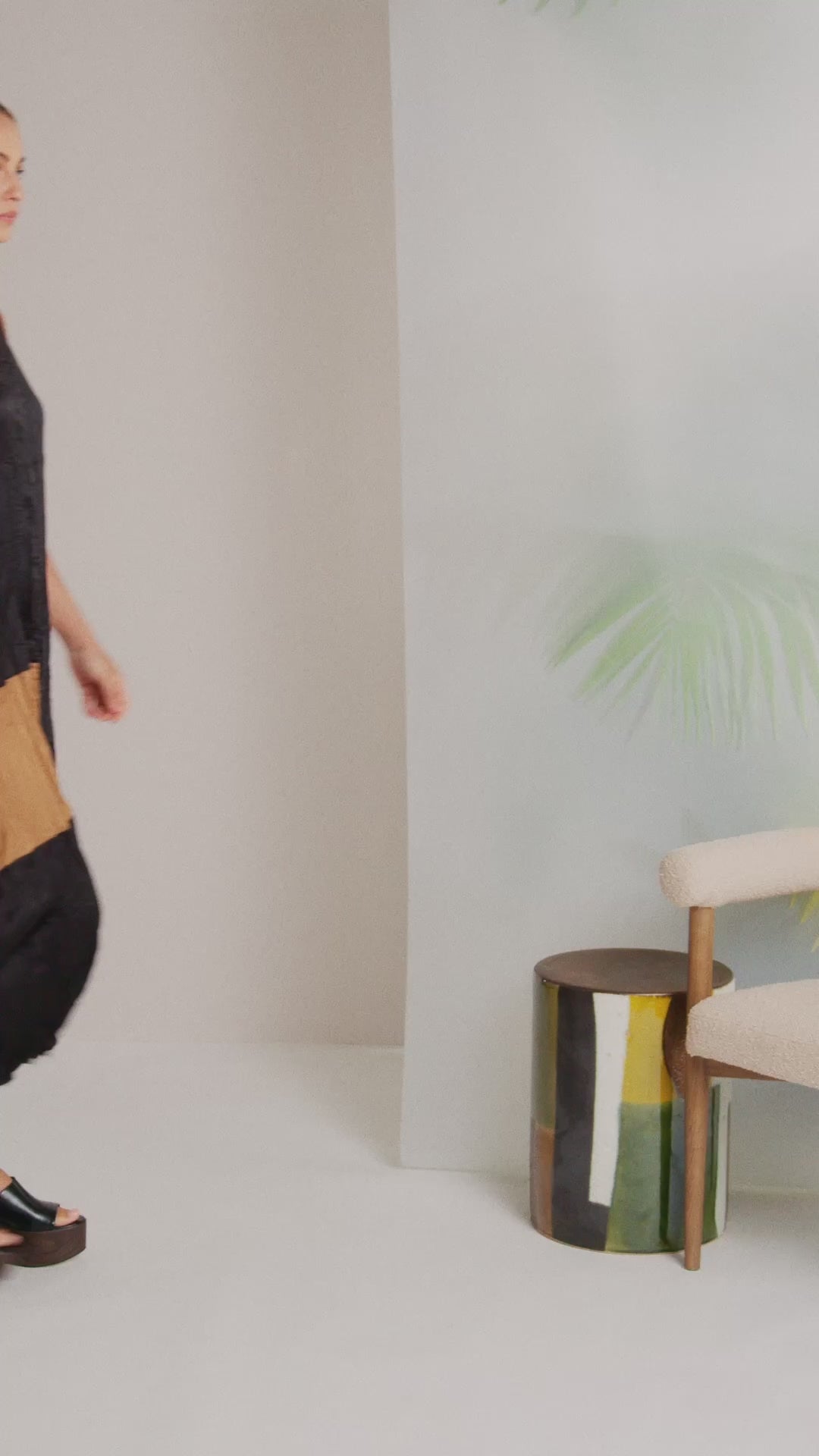 NAYA lavish the shift dress with texture and colour. This version raises the bar for all fashionistas. Featuring a crushed high shine fabric that flatters contrasting colour blocks in a very orderly yet delicate pattern. The back is completed with a tie close at the neck. A definite show stopper you need.