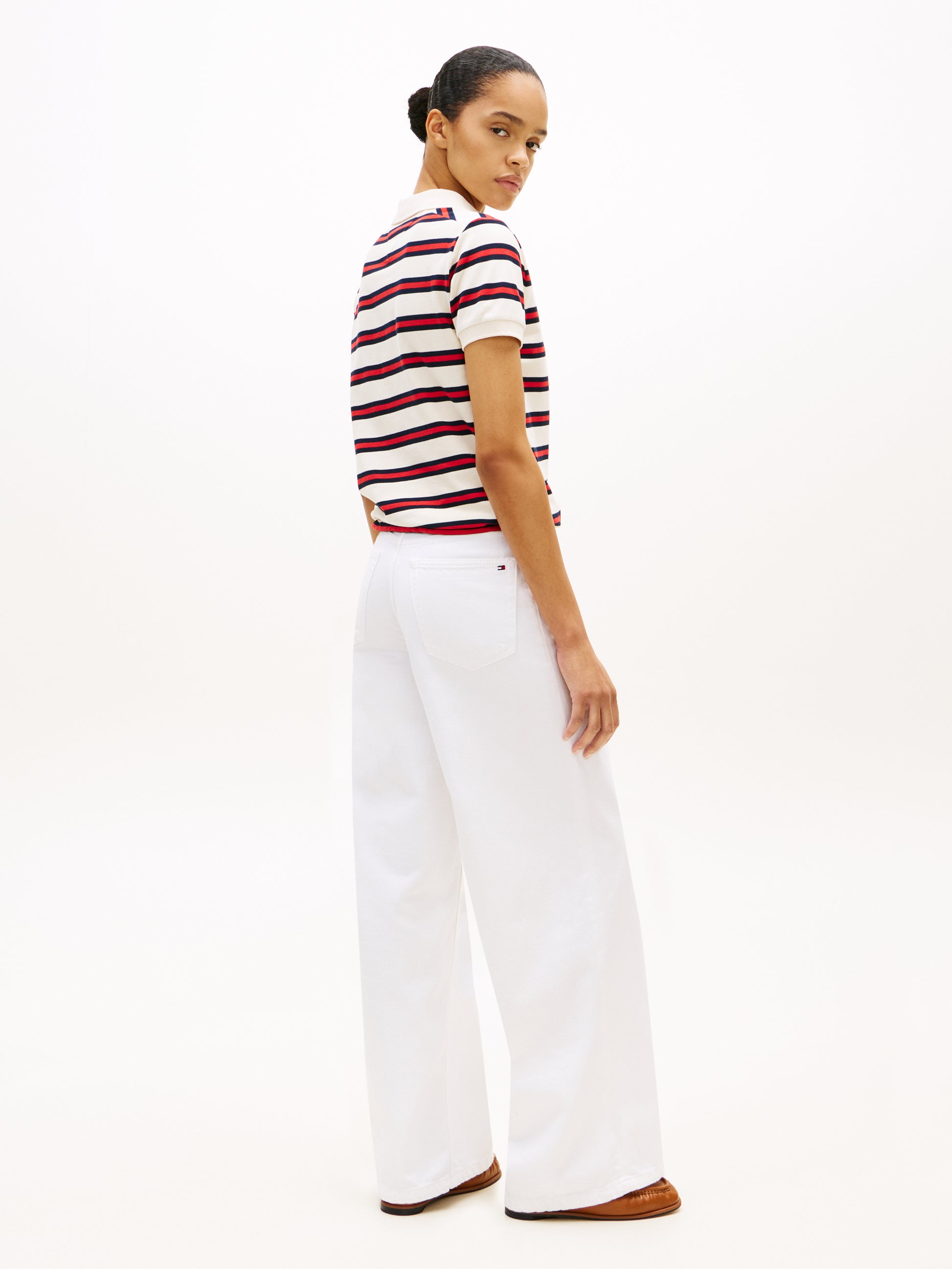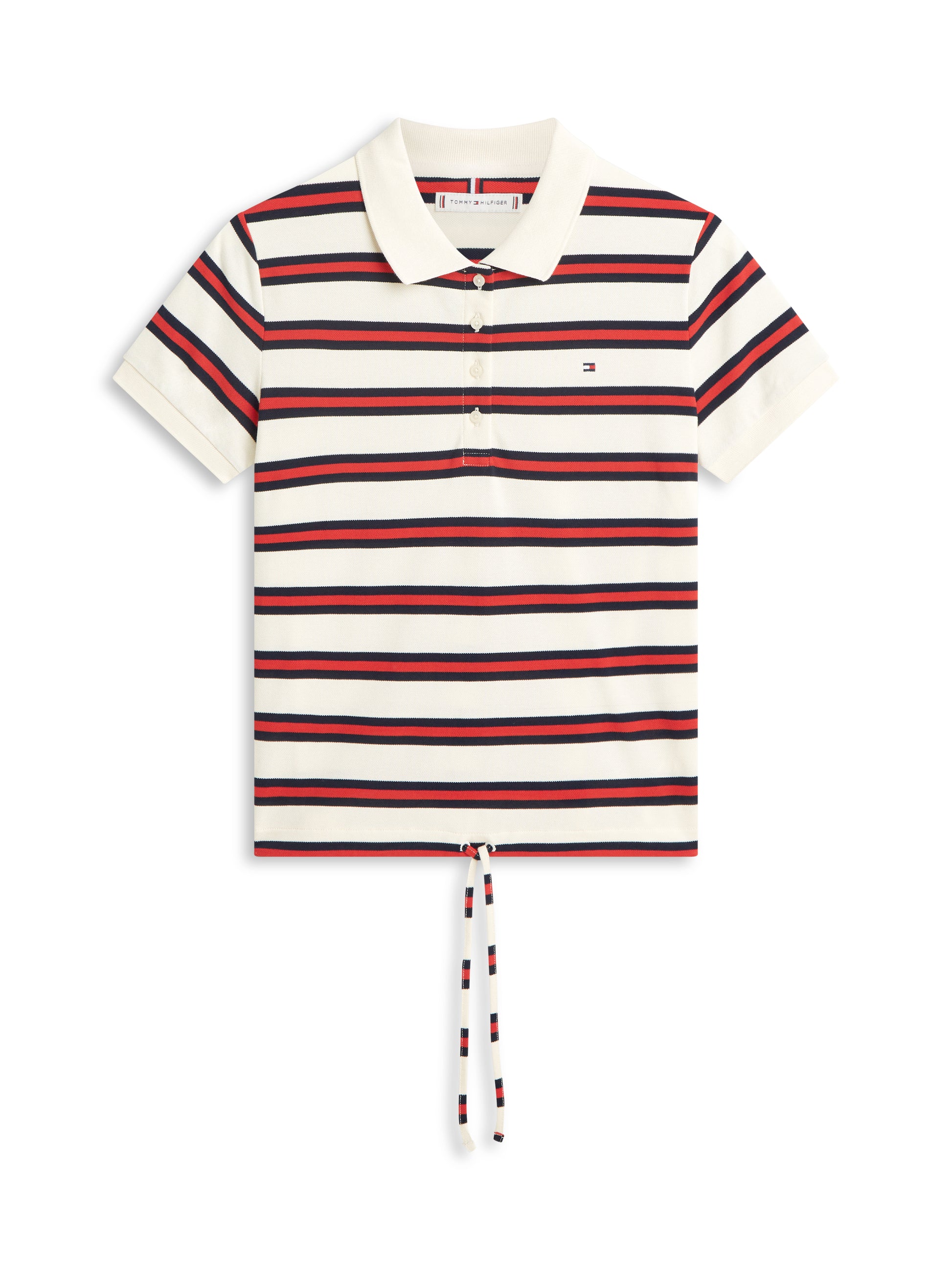Classic striped polo shirt featuring short sleeves and a refined button front closure. The distinctive tie detail at the waist adds a contemporary twist, creating a polished silhouette perfect for casual weekends or smart-casual occasions. Crafted with the quality and style Tommy Hilfiger is known for, this piece effortlessly transitions from day to evening wear. A versatile wardrobe essential that pairs beautifully with chinos, jeans, or tailored trousers.