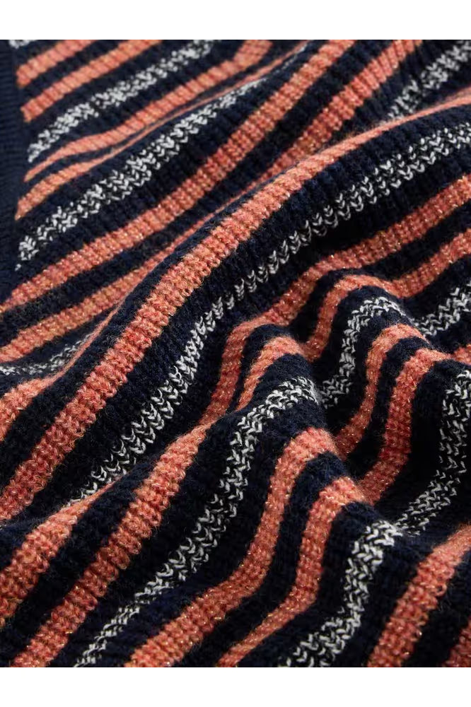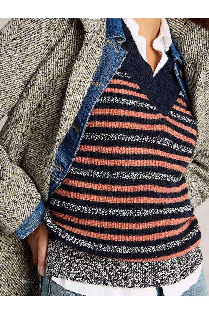 Forget the layering basics—this striped knitted tank is the versatile piece your wardrobe has been missing. The classic V-neck design pairs effortlessly over a crisp white tee for an instantly polished look, while the timeless stripe pattern adds visual interest to any outfit. Perfect for transitional dressing, it's the modern essential that works harder than traditional knitwear.